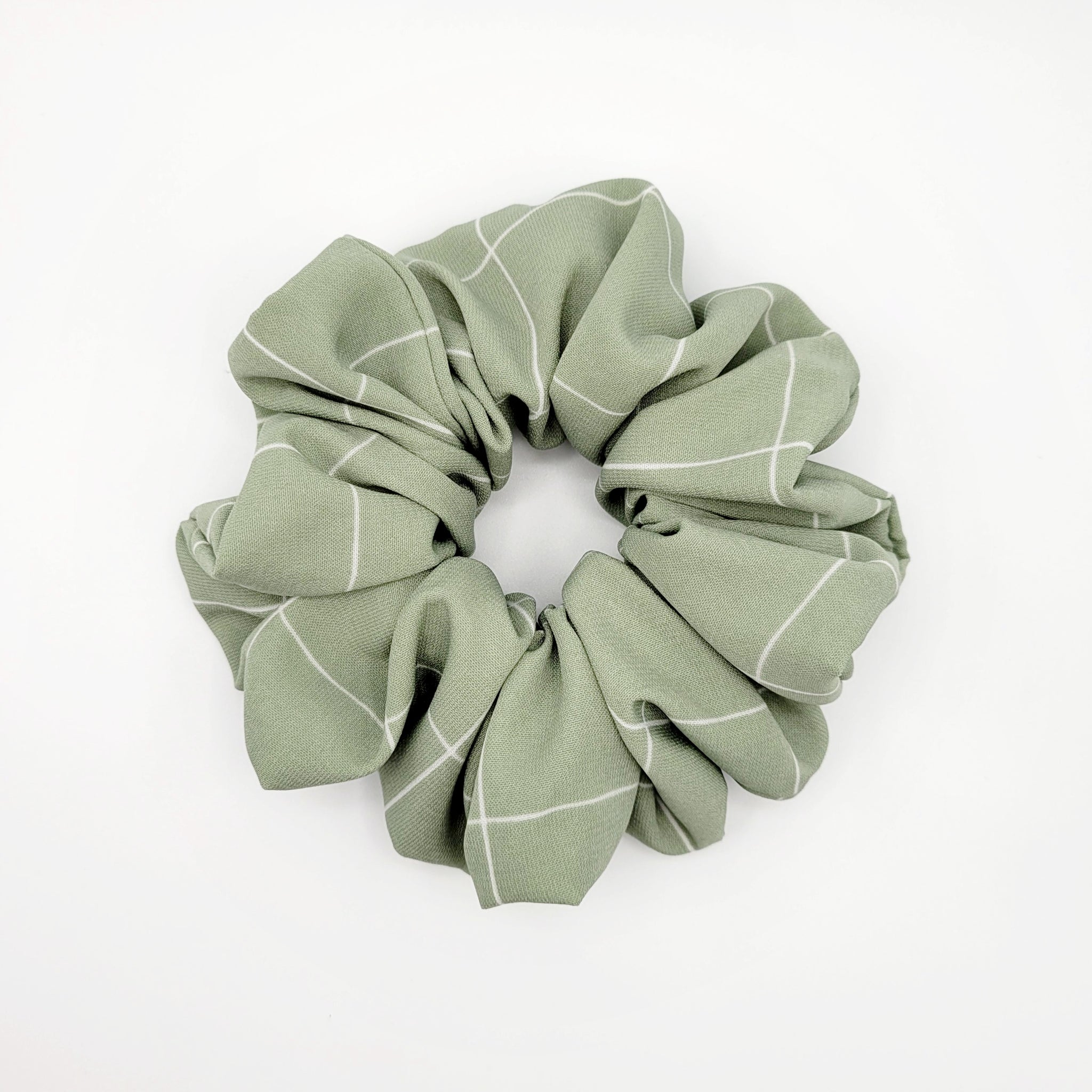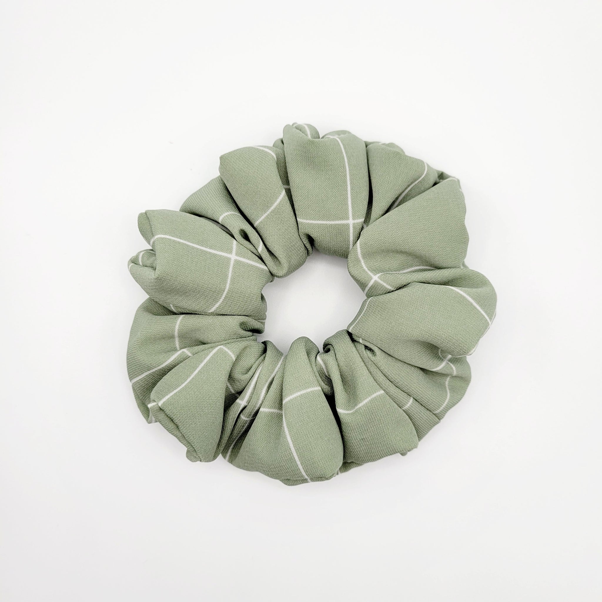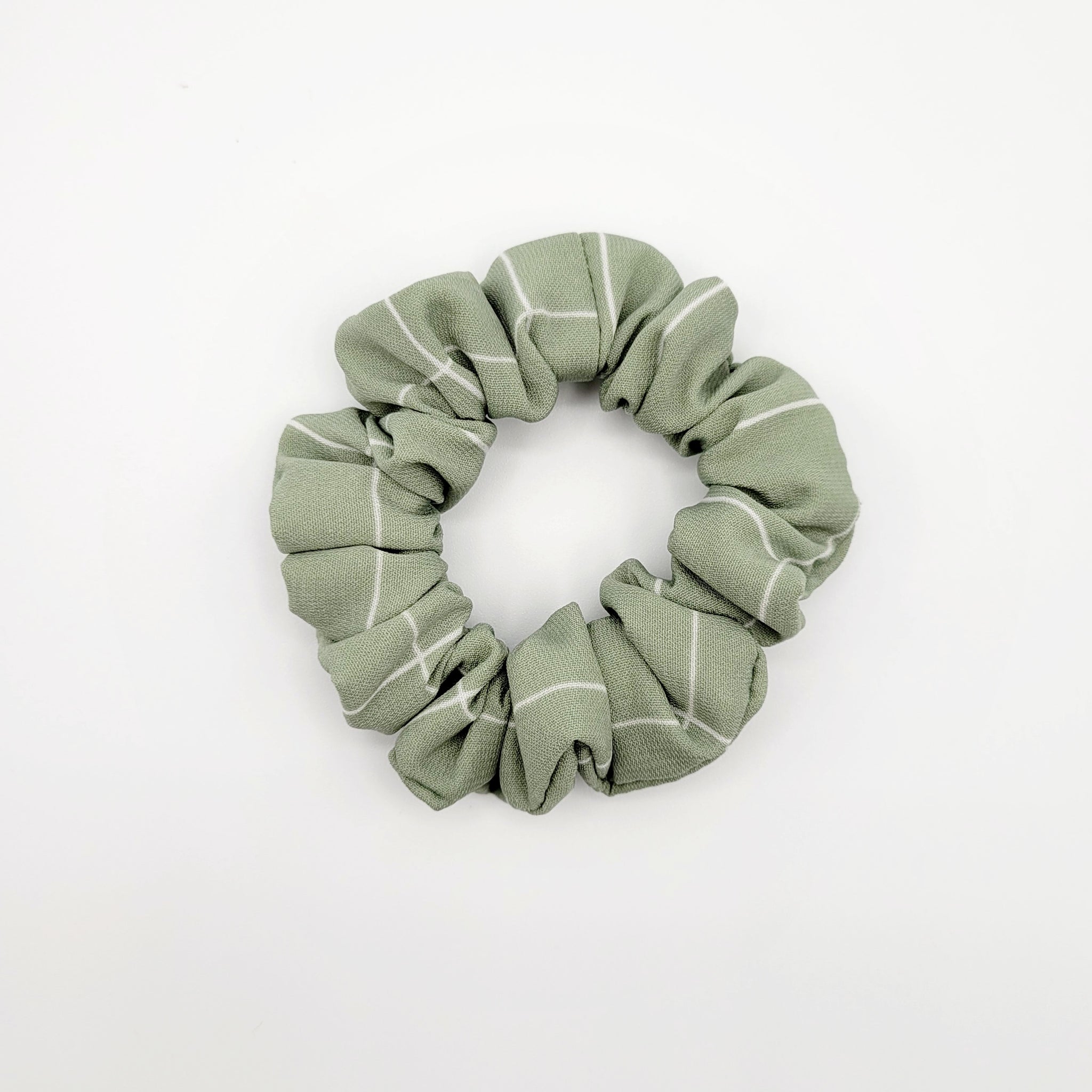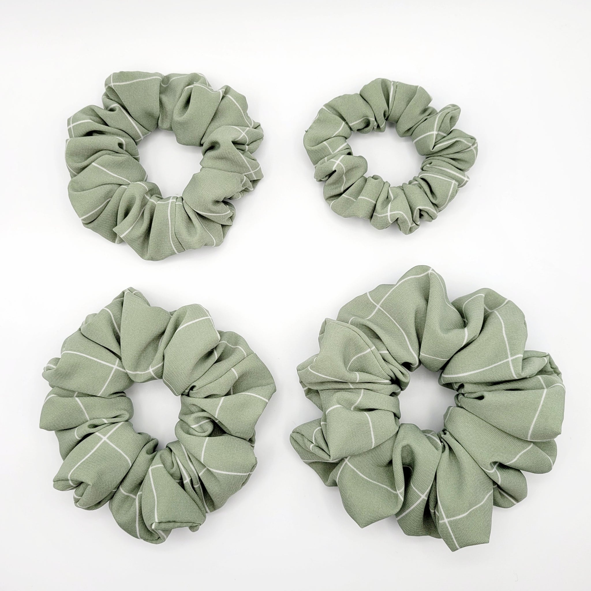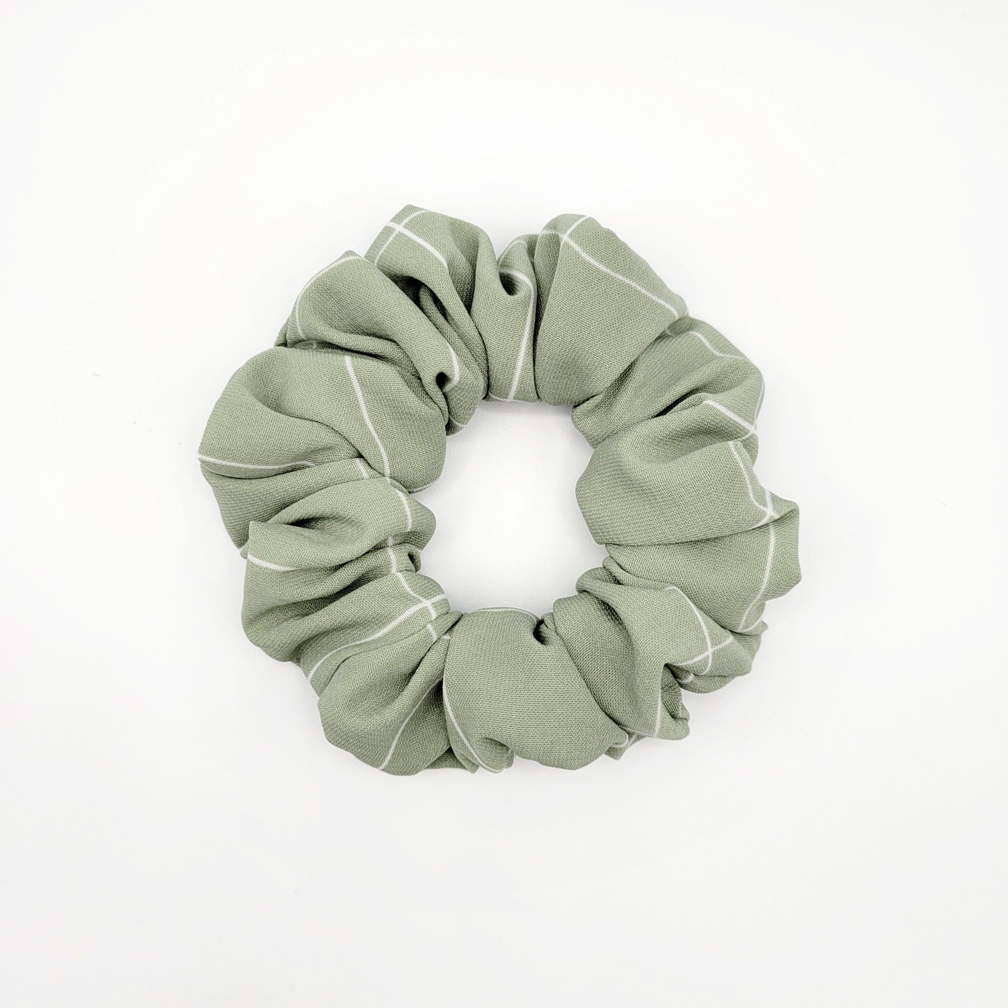 Voici le chouchou EVELYNE! Un magnifique chouchou sauge avec des petites lignes blanches. Offert en tailles petit, moyen, grand et EXTRA (XL).